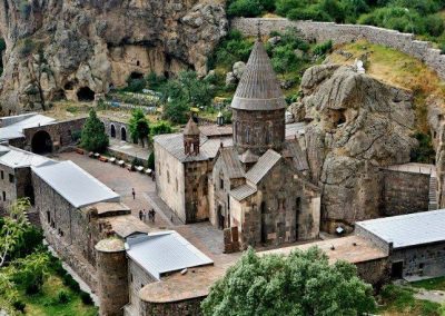 Visiting the Garni temple that is the only standing Greco-Roman colonnaded building in Armenia and Geghard monastery that illustrates Armenian medieval architecture at its highest point.